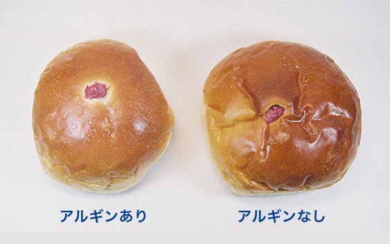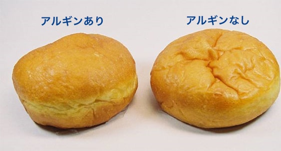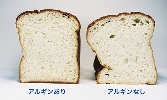 アルギンはパン生地の物性を改良します。対粉0.1~0.2%程度のアルギンを小麦粉に混ぜるだけで生地の保水力を向上し、小麦粉中のタンパク質に働きかけてパンの組織を強化します。焼成後には全体がふっくらと膨んでボリュームが増し、つぶれにくいパンが出来上がります。
