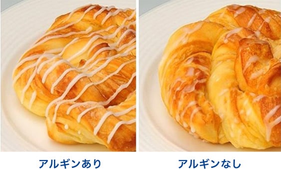 米粉は小麦粉よりも吸水性が高く、またグルテンがない分、パンに加工しても膨らみにくい性質があります。アルギンは米粉を配合したパンを形良く膨らませるとともに、口溶けの良い食感を与えて商品価値を高めます。