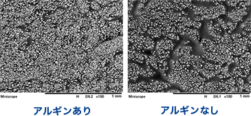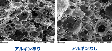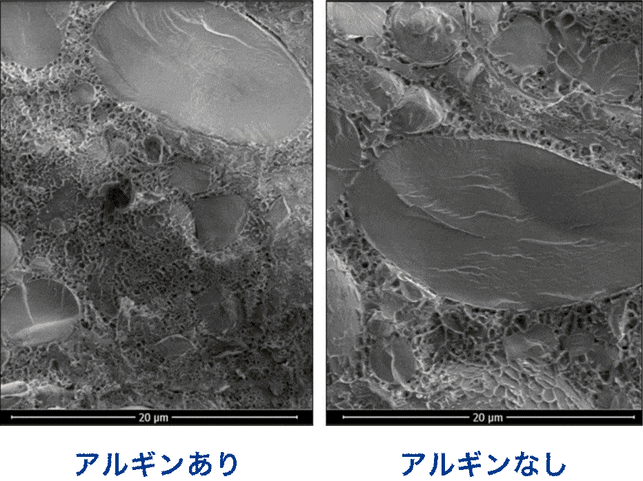 アルギンは小麦粉中のタンパク質に働きかけ、生地中に形成されるグルテンのネットワーク構造を均一で密な状態にすることが確認されています。この緻密なグルテンネットワークがパンや麺の構造をしっかりと支え、弾力性や歯ごたえを高める働きをしていると考えられます