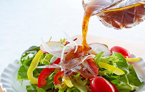 アルギンは塩分濃度の高い、酸性条件下であっても容易に溶解し、粘性を発揮します。この粘性はドレッシングの流動性や食感を改良するとともに、油滴の移動を抑え、エマルジョンの安定性を高める働きをします。さらに、ドレッシングの調味成分やドレッシングに加えられた食品素材を沈殿させないよう、安定させるためにも役立ちます。