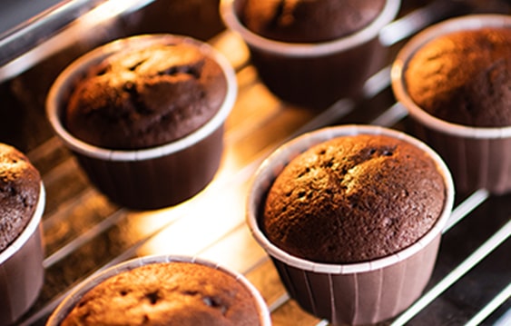 レンジアップケーキはオーブンや蒸し器で調理したケーキと比べてボリュームが十分でないうちにタンパク質が熱変性し、凝固してしまうため、固く「引き」の強い食感になってしまうことがあります。アルギンを加えることで生地のつながりが良くなり、短時間のレンジアップでしっかりと膨らませることができます。弾力性も向上するので、膨らんだケーキがしぼみにくく、良好な外観が長持ちします。