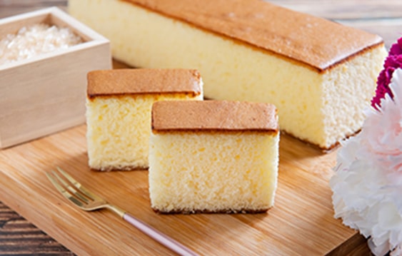 品質の良いカステラを作るとき、一般の小麦粉ではなく、保水性の高いカステラ専用粉を使うことがあります。専用粉で作ったカステラはふんわりと軟らかく焼き上がりますが、一般の小麦粉であっても、アルギンを配合することで専用粉に負けない、ふんわりとした食感のカステラを焼くことができます。さらに専用粉に対してアルギンを加えることで、軟らかさを維持しつつ、しっかり膨らませてしぼみにくいカステラを焼くことができます。