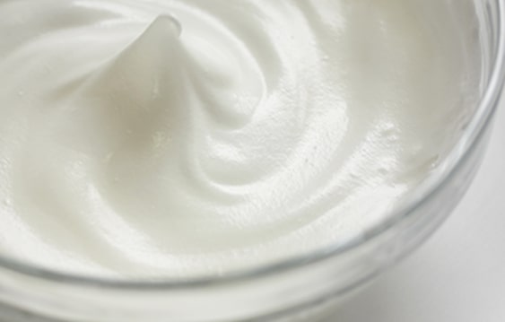 アルギンは卵白のたんぱく質に作用して泡の膜を強化し、きめ細かくて消えにくい泡を作ります。メレンゲが泡立つまでの撹拌時間が短くできることに加え、出来上がったメレンゲはなめらかで、きれいな角の立つ状態が維持されます。アルギンは卵白の鮮度や生卵成分のばらつきに影響されることなく安定した品質のメレンゲを作ることができ、クリーミーな外観と滑らかな食感が長持ちします。
