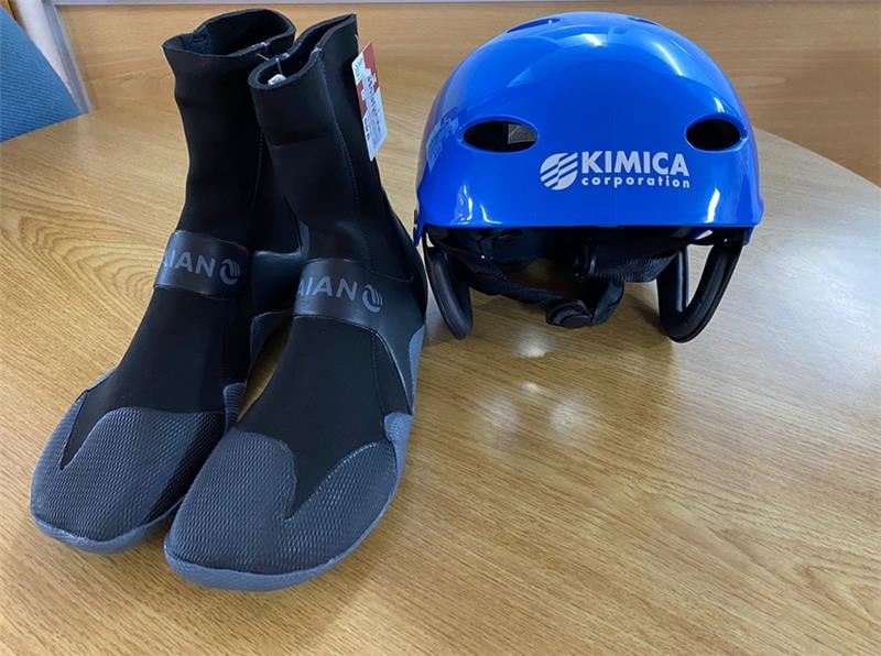 ▲漁民へ提供しているヘルメットと滑り止めのついた靴