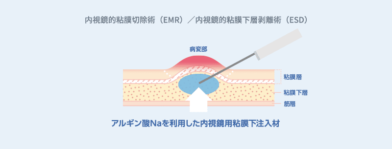 内視鏡的粘膜切除術(Endoscopic Mucosal Resection : EMR)や内視鏡的粘膜下層剥離術(Endoscopic Submucosal Dissection : ESD)の際に病変部を持ち上げるために使用する内視鏡用粘膜下注入材の原料として使用されています。