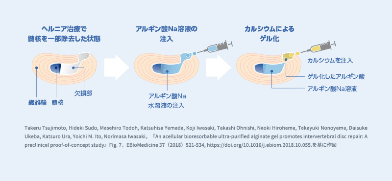椎間板ヘルニアの治療にアルギン酸Naを利用する研究が進められています。椎間板ヘルニアの⼿術において、ヘルニア組織を取り除いた後にできる椎間板内部の空洞は組織修復・再生の障害となることがあります。⼿術後も痛みが残る場合や、椎間板内部の組織変性が進んでヘルニアが再発したり、脊柱管狭窄症や変性すべり症などが進⾏して再⼿術になるリスクが指摘されており、新しい治療法の確⽴が望まれています。