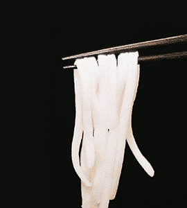 米粉を使った麺はつながりにくく、茹で時に溶け出しやすい性質があります。こうした不具合はグルテンによっても改善されますが、グルテンの多すぎる麺は表面が不自然にヌルついて、食感を悪くします。昆布酸501は、ごく少量(対粉0.1~0.2%程度)の添加で製麺性を著しく改善し、また食感を損なうこともありません。