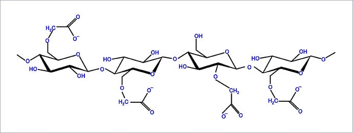 印刷するCMC(カルボキシメチルセルロース)は、天然パルプ由来のセルロースを加工して作られた増粘安定剤です。水に溶けないセルロースにカルボキシメチル基を導入することで可溶化し、増粘、吸水、保水などの優れた性能を発揮します。