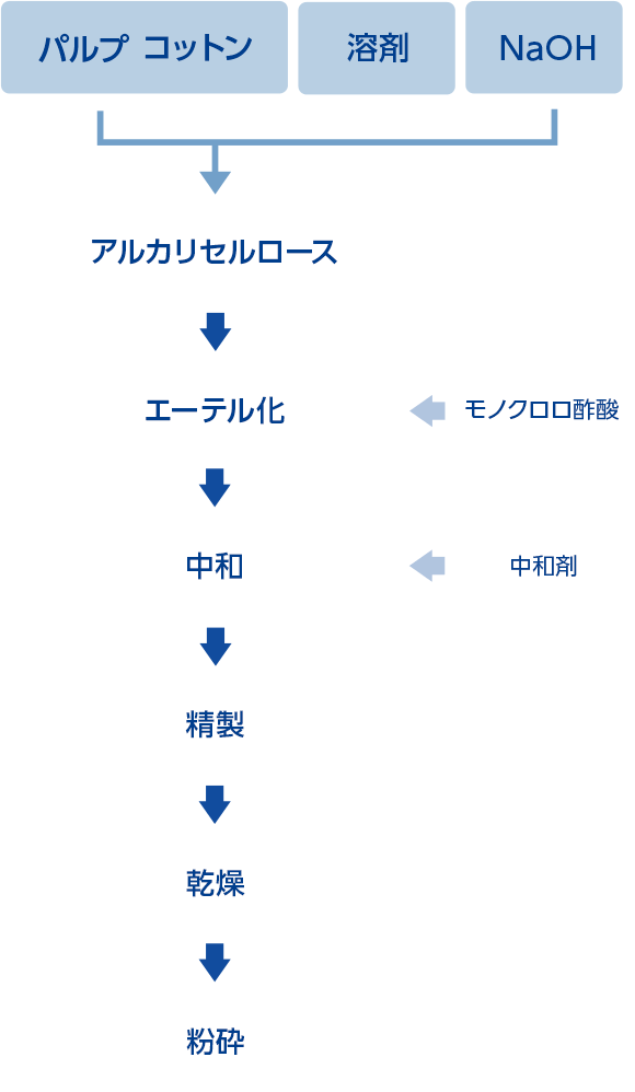 市販されているCMCにはナトリウム塩とカルシウム塩がありますが、キミカCMCはナトリウム塩(カルボキシメチルセルロースナトリウム)です。