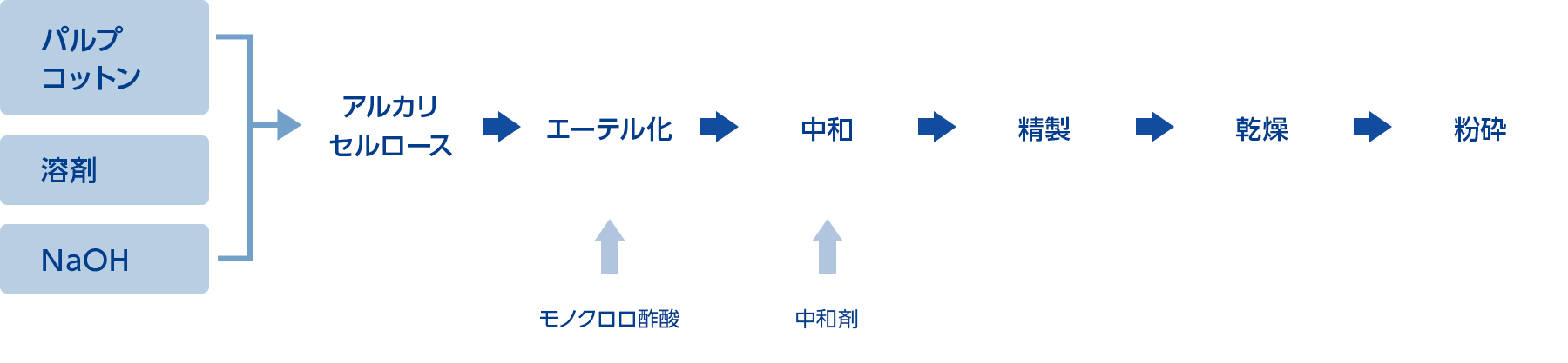 CMCは1918年にドイツで開発され、当初は「繊維素グリコール酸ナトリウム」と呼ばれていました。その後製法や品質の改良が進み、現在では食品、医薬品をはじめ、化粧品、繊維、土木、水産、製紙など、幅広い産業分野で利用される素材となっています。