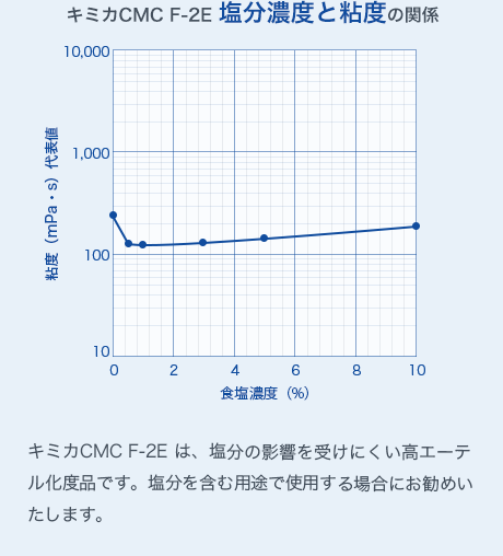 - 水溶液の粘度は経時変化が少なく、長期間安定です。
