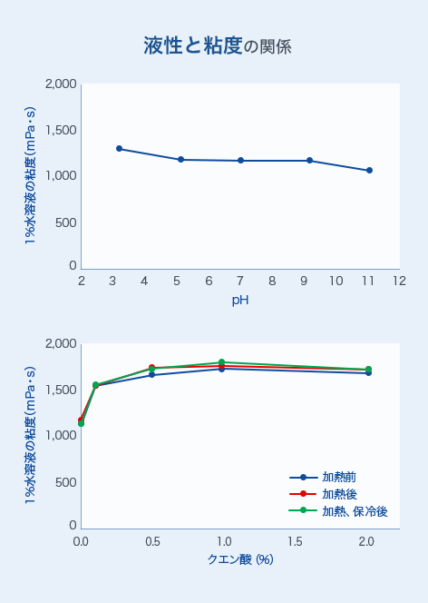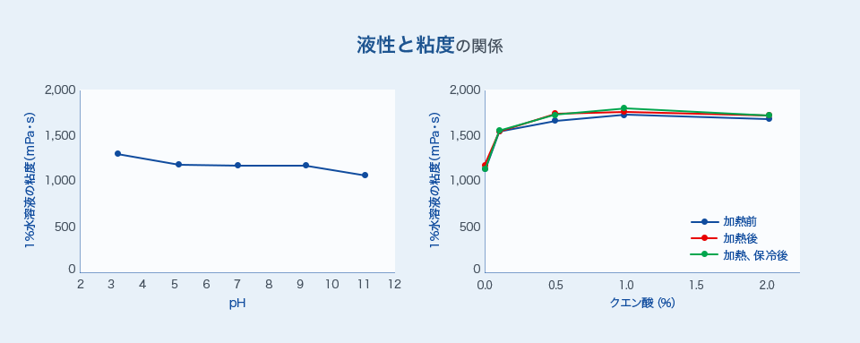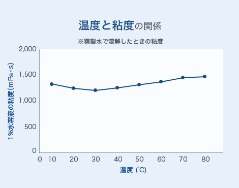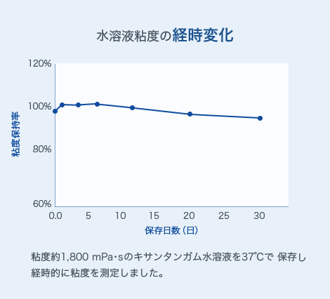 キサンタンガムの粘度は非常に安定しており、水溶液状態で保存した場合においても粘度の変化は極めて軽微です。