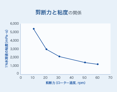 キサンタンガムの見かけの粘度は力を加えることにより変化します。力の加わらない状態では非常に高い粘度を示しますが、撹拌や震とうなどの強い力が加わると見かけの粘度は低下します。
