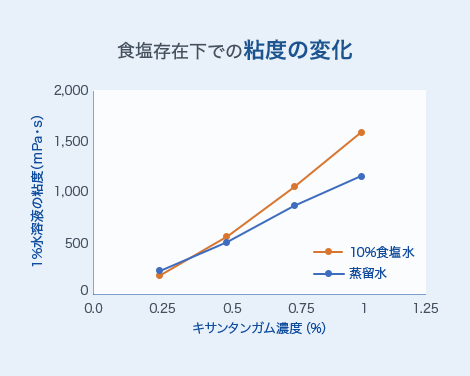キサンタンガムは高塩濃度条件下でも粘度が低下することはありません。