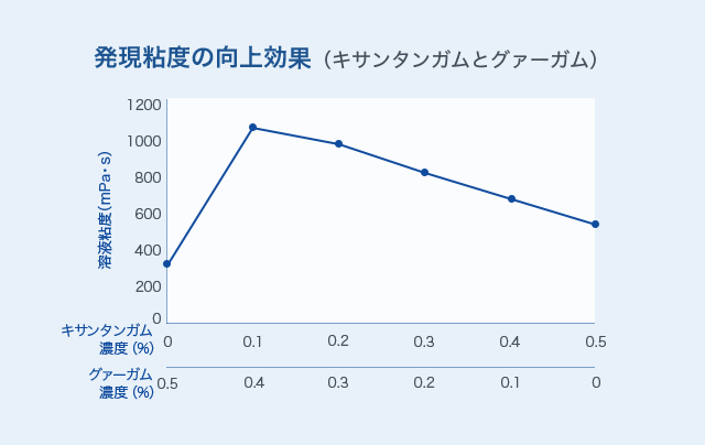 キサンタンガムとグァーガムを混合して溶解した溶液の粘度はそれぞれを単独で使用した時よりも遥かに高い粘性を発揮します。ローカストビーンガムでも同様の効果を得ることが出来ます。