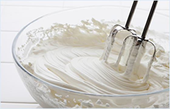 キサンタンガムはその高い粘性によって生クリームの乳化安定性を向上させます。これを泡立てたホイップクリームは、絞り出したときに角がしっかり立った美しい形状を長時間保つことができます。
