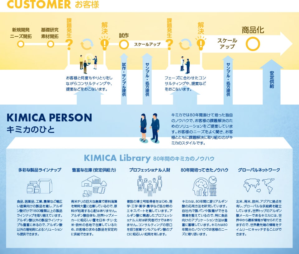 お客様の課題(ニーズ)に寄り添い、お客様とともに試行錯誤を重ねてアルギン酸の可能性を引き出し、ソリューションを提案する。それがお客様の商品開発に活かされて「お客様にとっての価値」に変わるまでをきめ細やかにフォローする。こうした「価値共創研究」こそが創業以来大切にしてきたキミカの研究開発スタイルです。