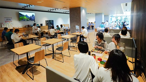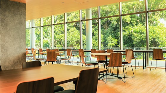 社員食堂は自然感じるカフェテリア風の空間です。ボリューム満点の美味しいランチを毎日200円で楽しむことができるほか、置き菓子も常備しています。建築物省エネ性能表示制度で最高評価の5ツ星を獲得した建物は社員の憩いの場となっています。