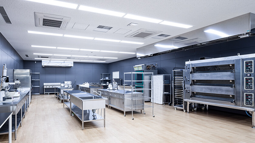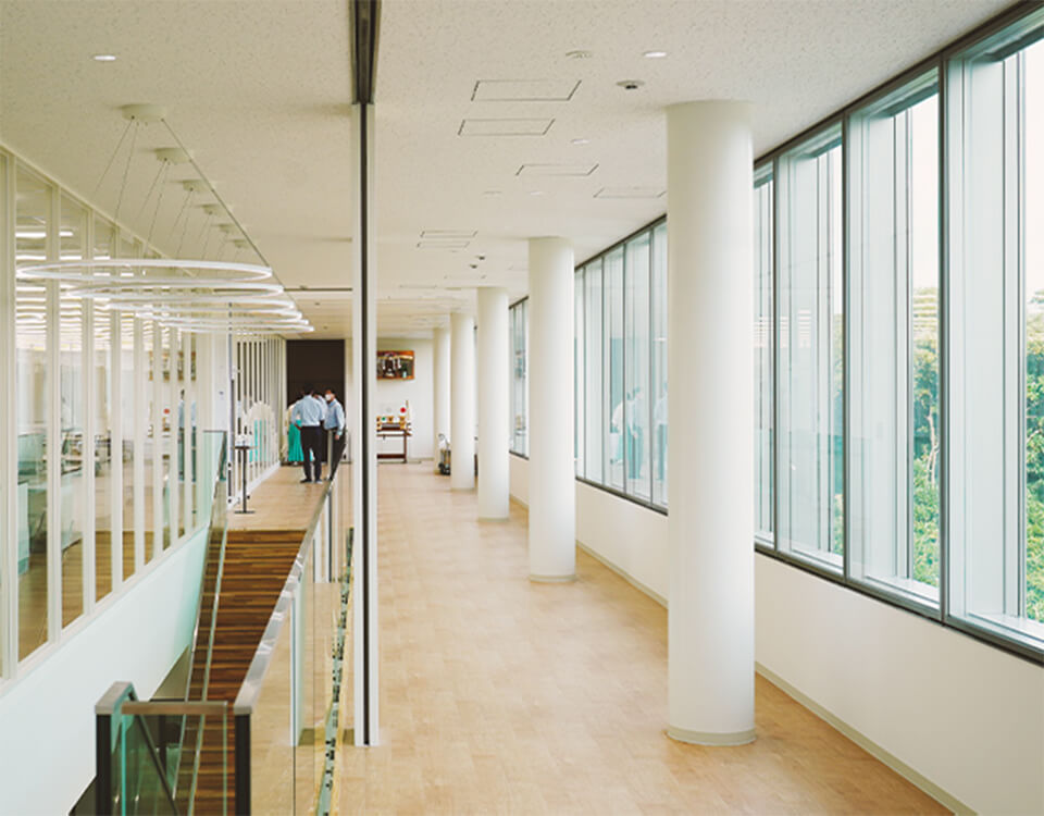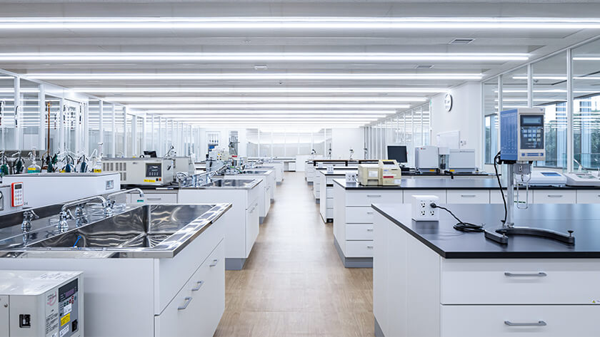 機器分析室や微生物試験室(クリーンルーム)、GMP試験室を備えた、世界水準の研究環境。常識を覆す全面ガラス張りのラボには、心地よい陽光がそそぎ、緑豊かな景観を望みます。プロ仕様の調理器具が揃う「食品アプリケーションラボ」には100名収容のセミナールームも併設されています。
