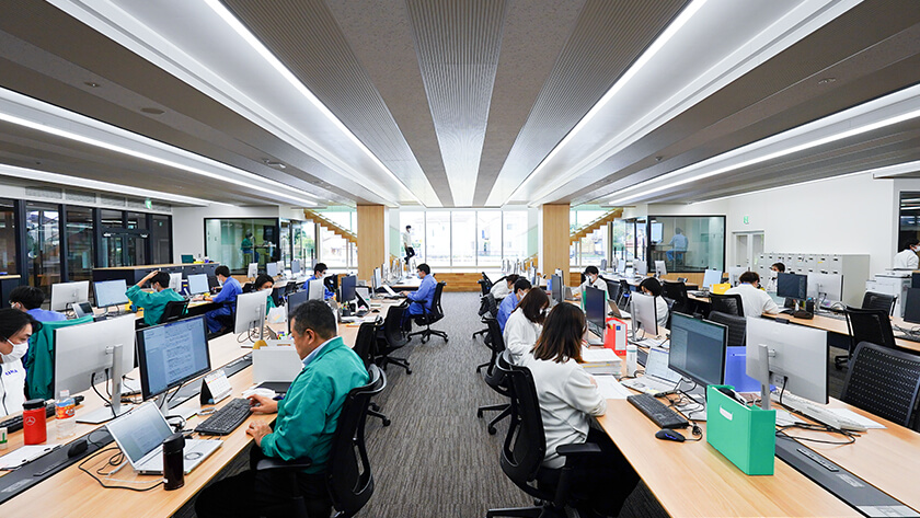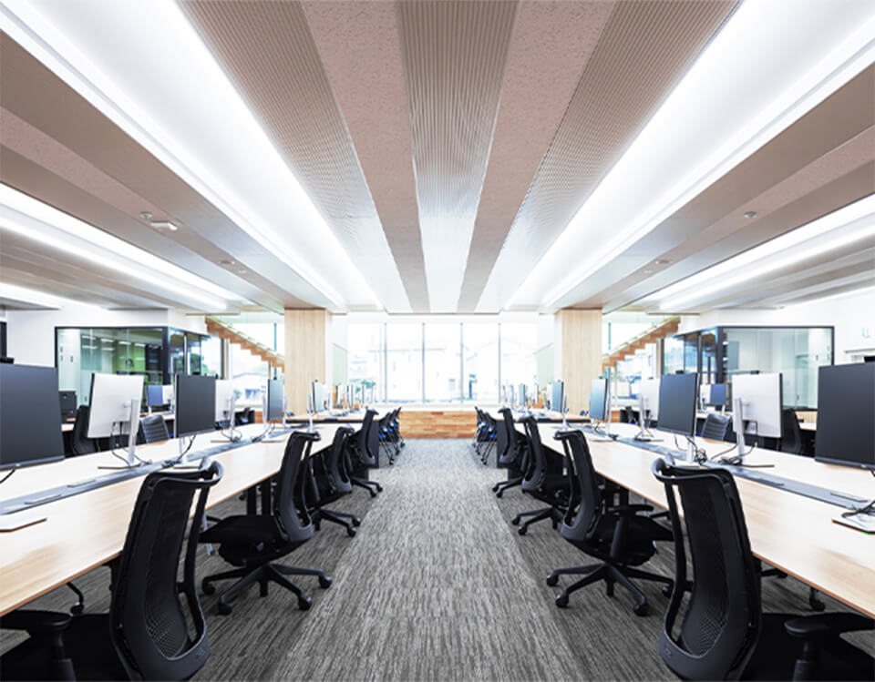 ダイナミックな構造設計が生み出した、22x70mの無柱空間にワンルームオフィスを配置。全席フリーアドレス制で、社員間のコミュニケーションを促しています。