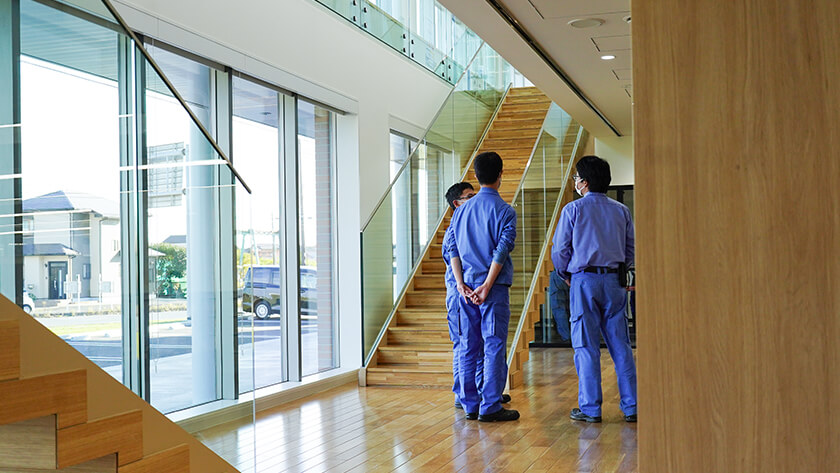 風の吹き出しがないため、温度ムラのない健やかな住空間を演出できました。換気にはコアンダ効果(天井に這わせてゆるやかな気流を送る)を応用し、ラボでの気流による粉舞いも防いでいます。