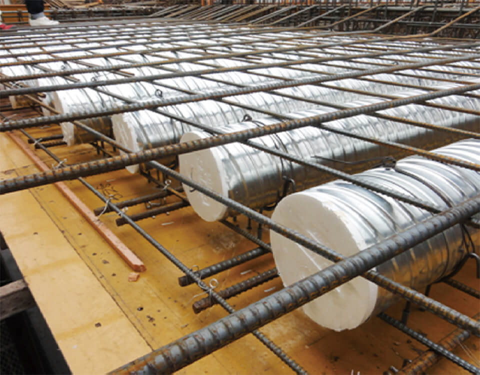 一般的な工法では、室内に柱が出てしまいます。けれども1、2階をつなぐ床に「ボイドPC工法」を採用することで、1階は18m、2階は22mも柱を飛ばすことに成功。巨大なワンルームオフィス、ワンルームラボは、社員の一体感を生むだけでなく、空調効率を高める役割も果たしています。制振性能に優れた分厚い床は、ラボの測定精度も高めます。