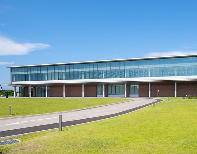 建物前面のフェンスを取り払い、広々とした緑地を地域に開放しています。その芝生を育む肥料には、海藻からアルギン酸を抽出したあとに残る「海藻残渣」を利用。天恵の資源である海藻を余すことなく利用する「もったいない精神」は、創業から80年間受け継がれてきた当社のDNAです。
