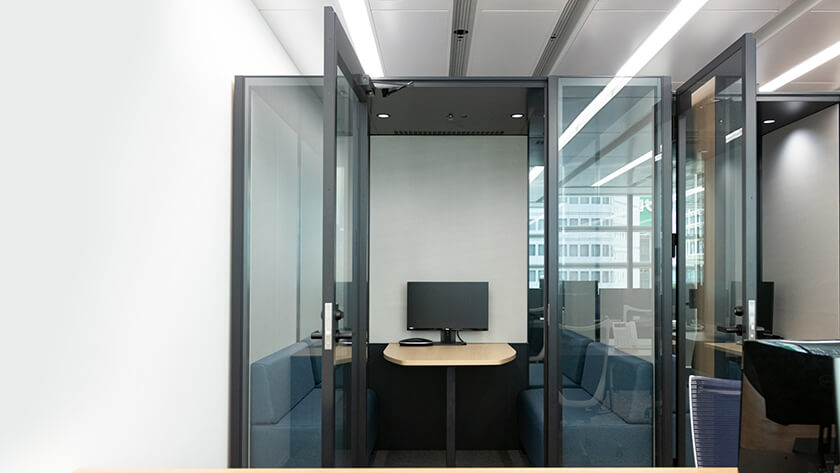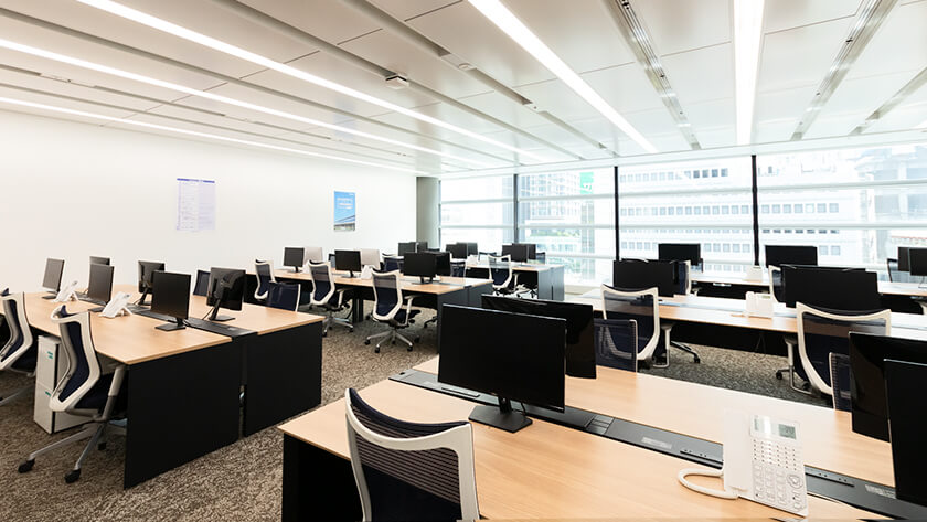 全面ガラス張りで開放的な、広々とした執務空間。自由度の高いフリーアドレス制で、お茶やコーヒーも飲み放題です。会議ブースも複数台設置されており、コミュニケーションを活発化します。