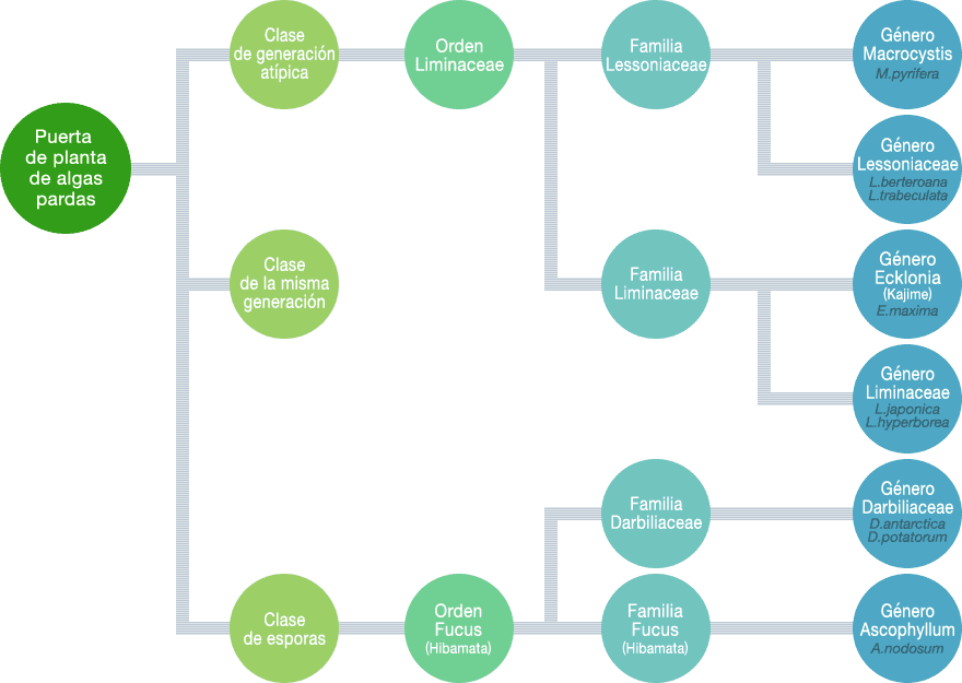 Existen varios tipos de algas pardas que son adecuadas para la producción en masa como materias primas industriales, como las algas gigantes que alcanzan hasta 60 m de longitud y las que tienen raíces adheridas al fondo marino que tienen 2 m de diámetro y crecen unos 60 cm por día.
