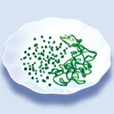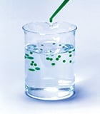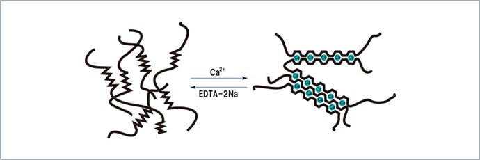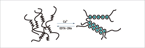 Cuando la sal de calcio entra en contacto con una solución de alginato de sodio, se forma un gel instantáneamente. Mediante esta función, es posible crear gelatina moldeada en forma esférica o de huso y utilizarla para realizar imitaciones de comida como huevas de salmón o aletas de tiburón.